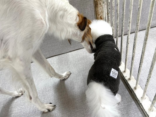 2023.10.22|本店 ボク、ここからお外出られること知ってるの! (コーギー うなぎくん) ぼくは隣が気になるなあ… (ポメラニアン ぐりくん) もこもこお洋服いいなあ~♪ (ボルゾイ エルくん、ビション ソワくん) あたち女の子ですけど!! (フレンチ コムギちゃん)